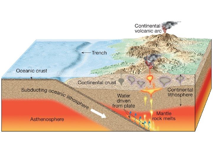What causes rock to melt • Role of volatiles (i. e. water and dissolved gases) – Volatiles (primarily water) cause rocks to melt at lower temperatures. – This is particularly important where wet oceanic lithosphere descends into the mantle.