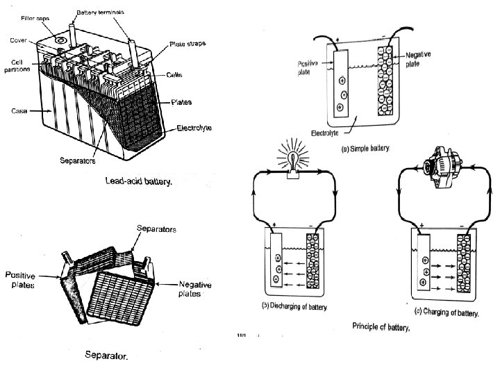 CONSTRUCTION OF BATTERY: 1. Battery Box: battery box is made of hard rubber having inside three or six cell compartments. • The capacity of the each cell is 2 volts. • The bunch of battery plates having positive and negative plates are separators and place in compartments. • Then by placing cover it is covered by cell cover. This cover has three holes for negative, positive and third for vent plug. 2. Battery plates: Each cell has set of positive and negative plates and each are separated by separator. • There is one more plate of negative than positive in each cell. • These plates are made of lead in the form of grids. • Positive plates lead peroxide (Pb. O 2)is pasted and has chocolate color while negative plate lead antimony is pasted and of grey color. 3. separator: separators are placed in between negative and positive plates. • Separators made of wood or plastic are place so that plates should not touch each other. 4. Electrolyte: it is made 64% of distilled water(H 2 O) and 36% of sulphuric acid (H 2 SO 4). 5. Vent Plug: when battery charge or discharge then chemical action takes place and gases formed and to release the gases a small holes are made in it.