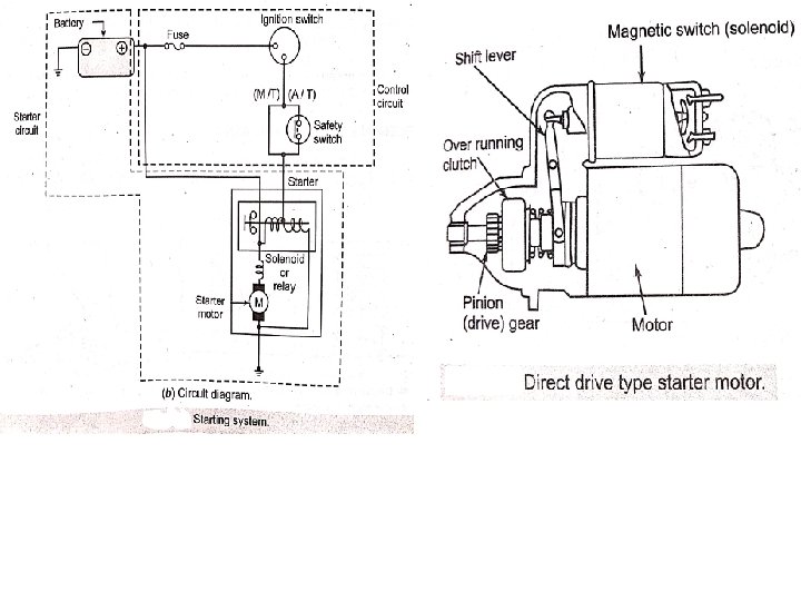 STARTING SYSTEM: • The internal combustion engine used in automobile is not capable of self starting. • The starting system rotates the engine until it can continue itself. • The starting system is a combination of mechanical and electrical parts that work together to start the engine. • the starting system is design to convert electrical energy from battery into mechanical energy in the starting motor. • This motor then transfers the mechanical energy, through gears, to the flywheel on the engines crankshaft. The basic starting system consists of the following parts: 1. Battery, 2. Ignition switch, 3. Magnetic switch( either an electrical relay or a solenoid), 4. Starter motor, 5. Safety switch.