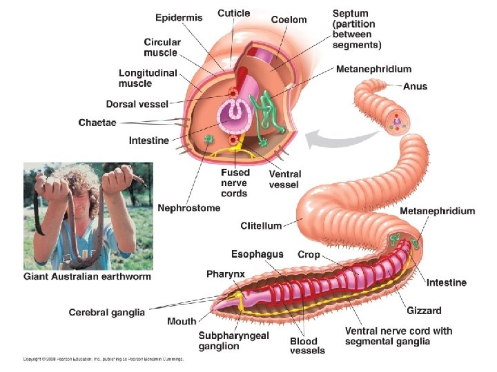 II. Animal Diversity a. Lophotrochozoans 3. Spiralians – wormy or segmented a. Annelida – segmented worms 2. Body Plan - coelomate: true body cavity - segmentation – allows for specialization of body parts and refined locomotion; the first step in our process of “duplication, specialization, and fusion” - complete gut allows for specialization: Mouth – pharynx – esophagus - crop – gizzard - intestine