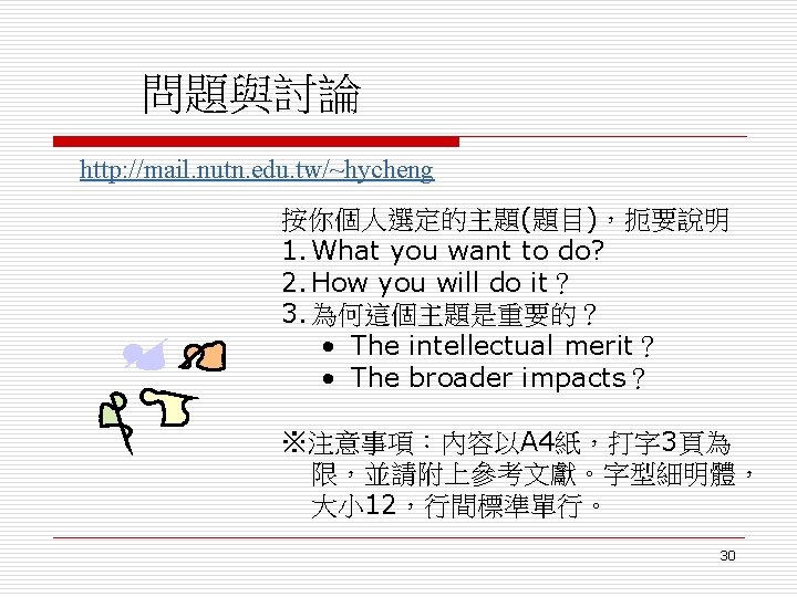 2. Criteria for evaluation o Four items in evaluation (NSF) : 1. 2. 3. 4. Research performance competence ( 執行能力) Intrinsic merit (內在價值)of the research Utility (實用) or relevance of the research Effect of research on the infrastructure (基礎建設) of science 7