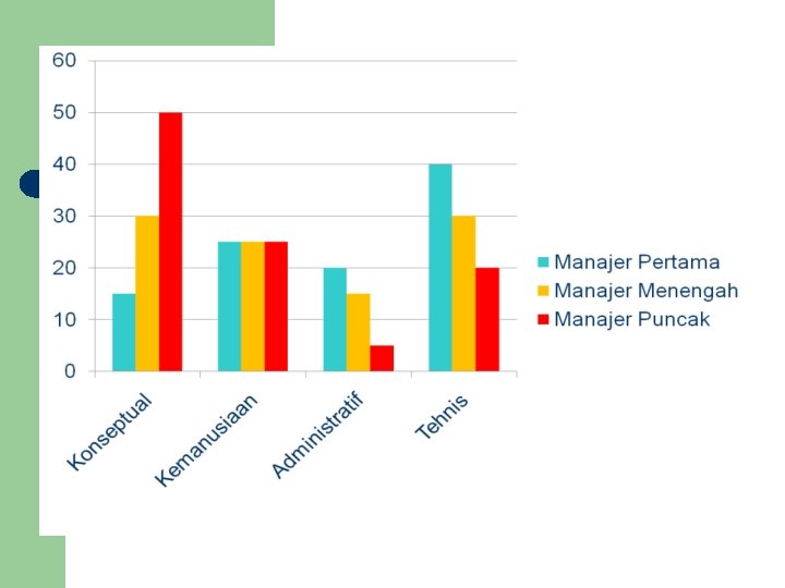 Manajer Puncak MANAJEMEN ADMINISTRATIF Penentuan tujuan, perencanaan, pengorganisasian, penyusunan personalia, dan pengawasan. Manajer Menengah Manajer Lini Pertama MANAJEMEN OPERATIF Pengaeahan dengan memotivasi, supervisi, dan komunikasi. Perbedaan Manajer administratif dan operatif dalam melaksanakan fungsi-fungsi manajemen.