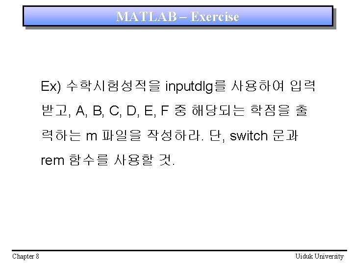 MATLAB – Selective Statement (Switch-Case) EX) k = input('k 값은 ? '); y = rem(k, 2) switch(y) case 0 disp(‘짝수가 입력되었습니다. '); case 1 disp(‘홀수가 입력되었습니다. '); end Chapter 8 Uiduk University