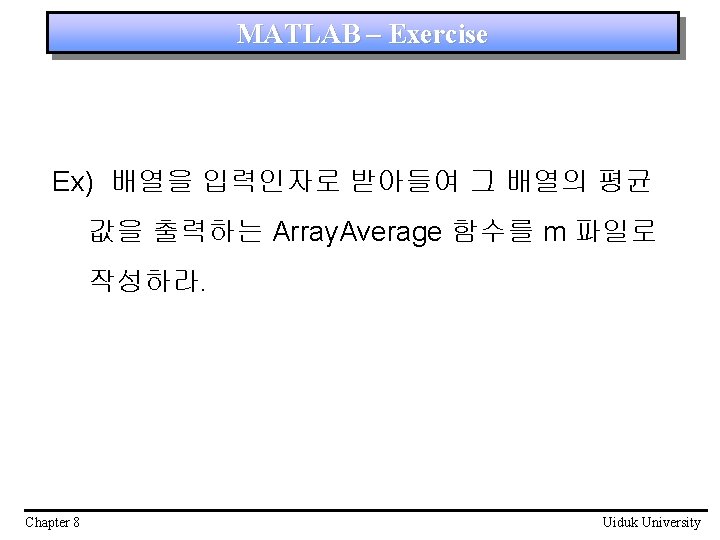 MATLAB – Function with Multiple Output EX) >> A = [ 4, 6, 2, 8, 16] A= 4 6 2 8 16 >> [m, M] = Min. Max(A) m= 2 M= 16 Chapter 8 Uiduk University