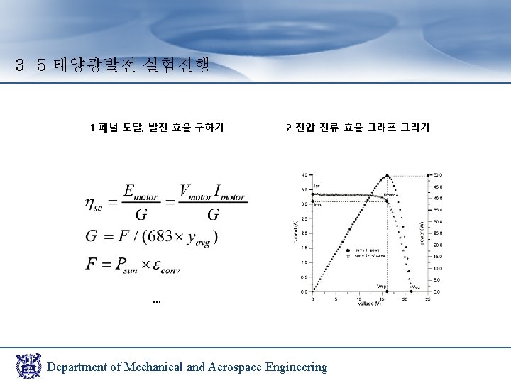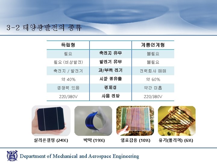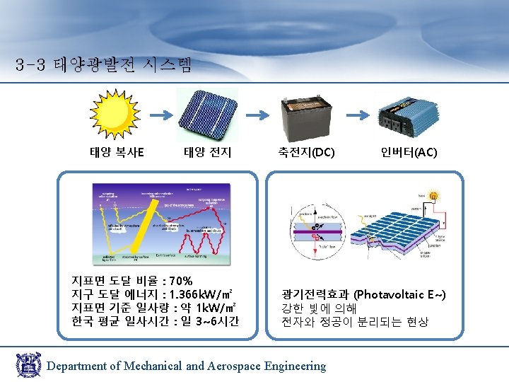 3 -4 태양광발전 실험장치 구성 인공 태양 태양 전지 패널 축전지(DC) Department of Mechanical and Aerospace Engineering 인버터(AC)