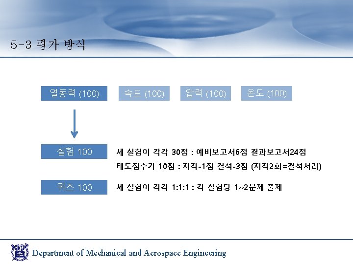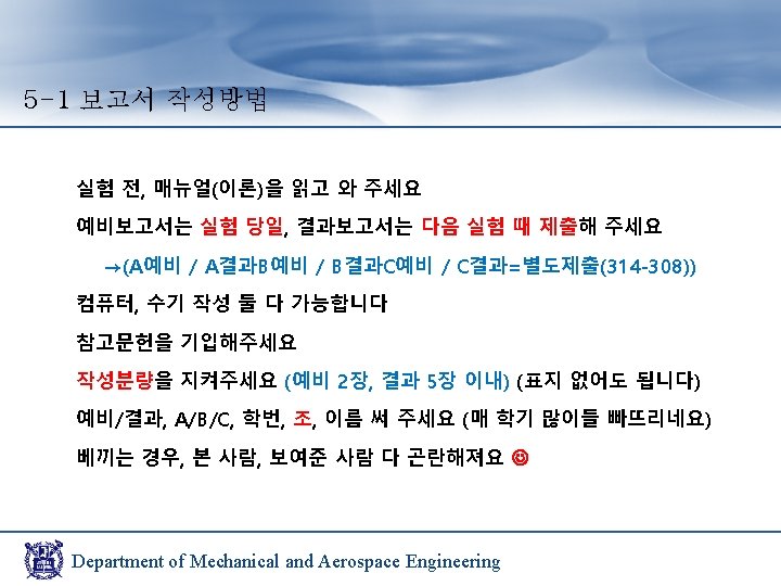 5 -2 실험 조 통합 운영 통합 예시 1조 목 16: 00 2조 목 17: 00 3조 금 16: 00 4조 금 17: 00 1조 2조 목 16: 00 3조 4조 금 16: 00 Department of Mechanical and Aerospace Engineering
