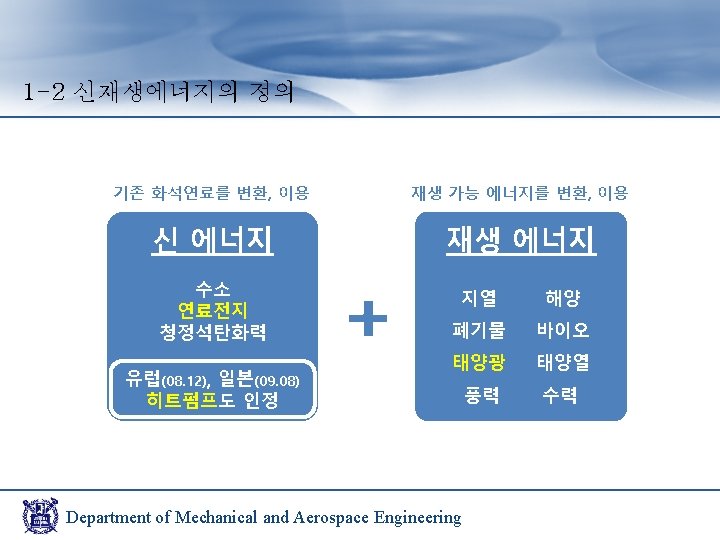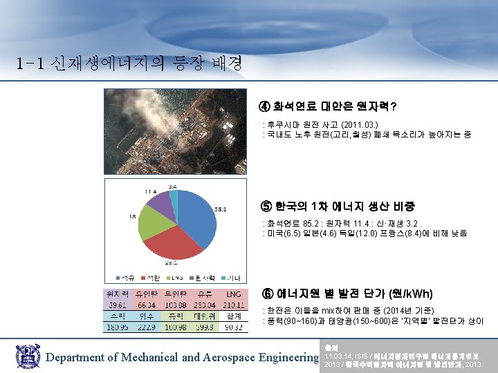1 -3 신재생에너지의 현황 국내보급현황 (천TOE) ※ TOE : 석유 환산 톤 Department of Mechanical and Aerospace Engineering