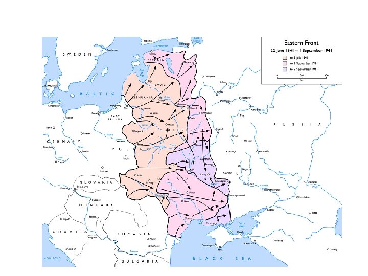 • U kratkom vremenu Nemci su osvojili pribaltičke republike, Belorusiju, deo Ukrajine • Na severu Nemci su se približili Lenjingradu, a u jesen 1941. god. Lenjingrad je bio opkoljen, grad je bio pod opsadom skoro 900 dana (početak 1944. god. ) • Na centralnom pravcu Nemci su zaustavljeni neposredno pred Moskvom • Sovjetski gubici su bili veliki, bili su posledica iznenadjenja, neobučenosti, i nedostatka iskusnog oficirskog kadra (iskusni oficiri su stradali u Staljinovim čistkama) • Krajem 1941. god. sovjetska pojačanja, dovedena sa Dalekog istoka, prešla su u kontraofanzivu kod Moskve, tako da su Nemci odbačeni od grada