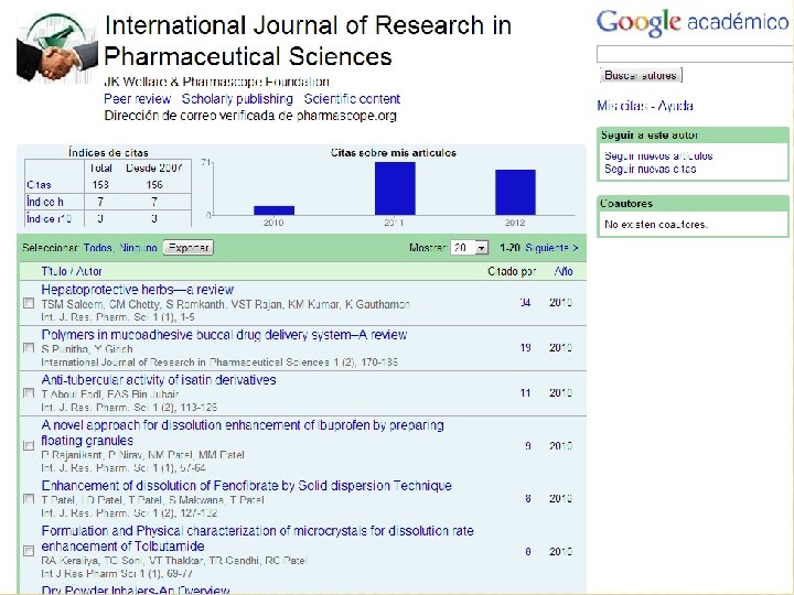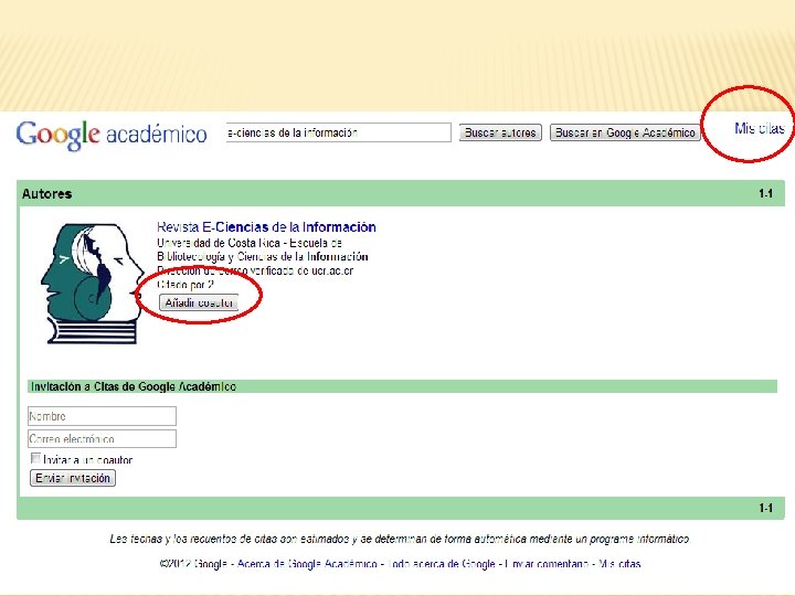 PROBLEMAS… El país que lo asigne fuera de estas empresas, debe tener sus bases de datos propias y actualizadas � Debe contar con un sistema de recompensa único (México, Argentina, Chile, Colombia) � En América Latina se pueden usar como alternativas Sci. ELO o REDALy. C que aplican indicadores � O usar Google Citations, pero debe incluir la revista: http: //scholar. google. com/citations? hl=es&view_op=s earch_authors&mauthors=eciencias+de+la+informaci%C 3%B 3 n (REGISTRO) �
