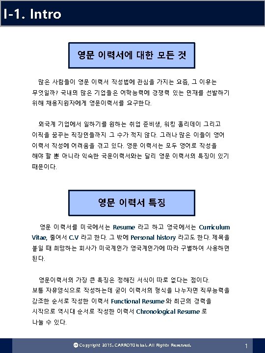 Appendix-1. 샘플 이력서 영문 이력서 SAMPLE 07 연대기식 이력서(Chronological Resume) Joan Durban 12 Poplar Avenue Hope, Arkansas Experience 1992 - Present Assistant to the Chief Engineer, Homes, Inc. , Hope, Arkansas, a small rural low-income housing development firm with state-funded business of $1, 300, 000 annually. Supervised foundation design team of 3 engineers in implementation of CAD software. Salary $3, 045/mo. 1989 -1992 Planner, Engineering Division, City of Little Rock, Arkansas. Responsible for researching availability of new technologies for cutting costs of maintaining, repairing, upgrading, and expanding municipal sewer system. Salary $2, 450/mo. 1985 -1989 Architectural Planner 1, Department of Recreation, City of Avalon, New Jersey. Assisted in conversion of military facilities to playgrounds in low-income neighborhoods. Salary $1, 800/mo. Education Columbia School of Architecture, M. S. Architectural Engineering, 1985. Colorado School of Mines, B. S. Civil Engineering, 1982. Ⓒ Copyright 2015. CARROTGlobal. All Rights Reserved. 24