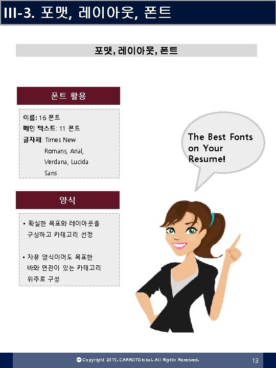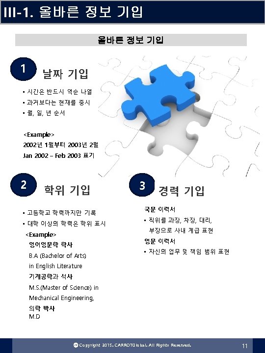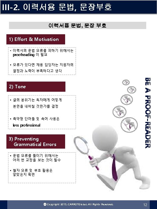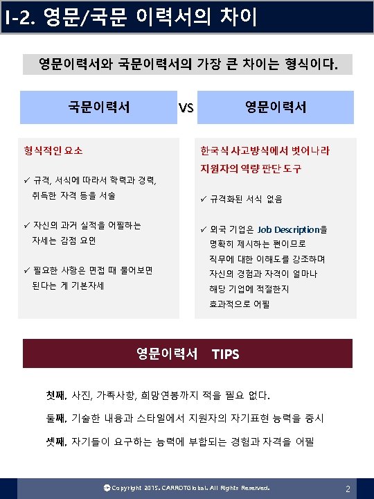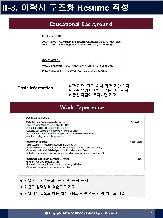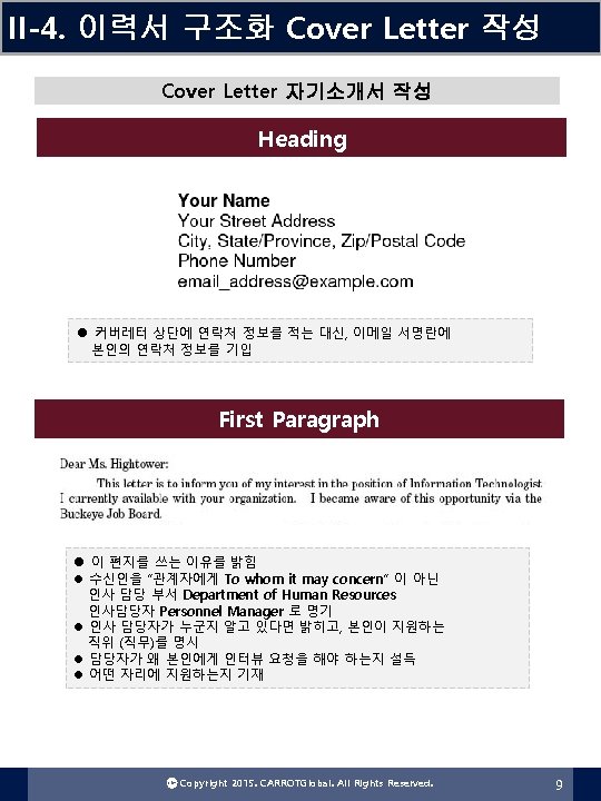 II-4. 이력서 구조화 Cover Letter 작성 Cover Letter 자기소개서 FORMAT 본인의 연락처 정보 인사말 편지 쓰는 이유 자격요건 설명 What I can do for you! 감사 표현 Ⓒ Copyright 2015. CARROTGlobal. All Rights Reserved. 8