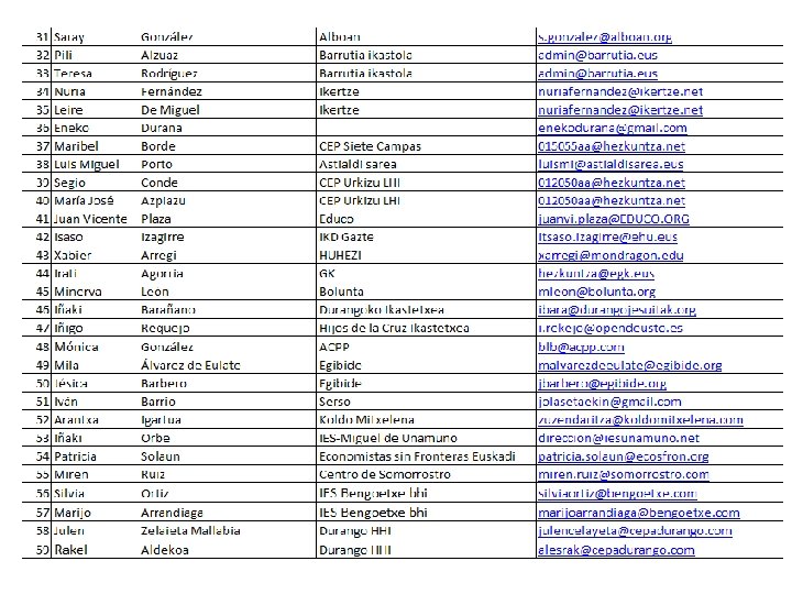 III Heziketa Topaketa Agenda Egitaraua Ikasketak sortzen Generando aprendizajes ¿Qué habría que mejorar? • Presentar experiencias más diversas, que realmente reflejen la diversidad de la comunidad • Abrir algún espacio para saber quiénes estamos y de dónde venimos • Trabajo en grupos pequeños • Tener los materiales con antelación • La cuestión del sonido, poner un micrófono • Más dinamización entre parte y parte del encuentro • La metodología, romper con el método exposiciónoyente • Más tiempo para compartir y reflexionar • Mayor concreción • Si es posible, sentarnos en círculo • Recoger y priorizar 3 medidas o reivindicaciones para mejorar el sistema educativo y trasladarlas a organismos competentes