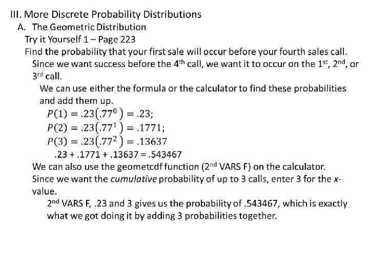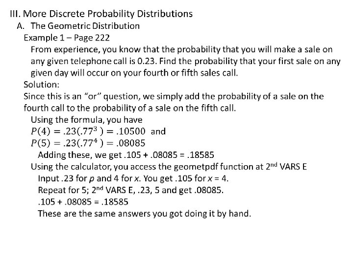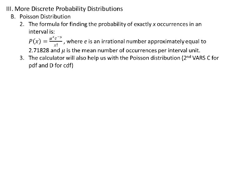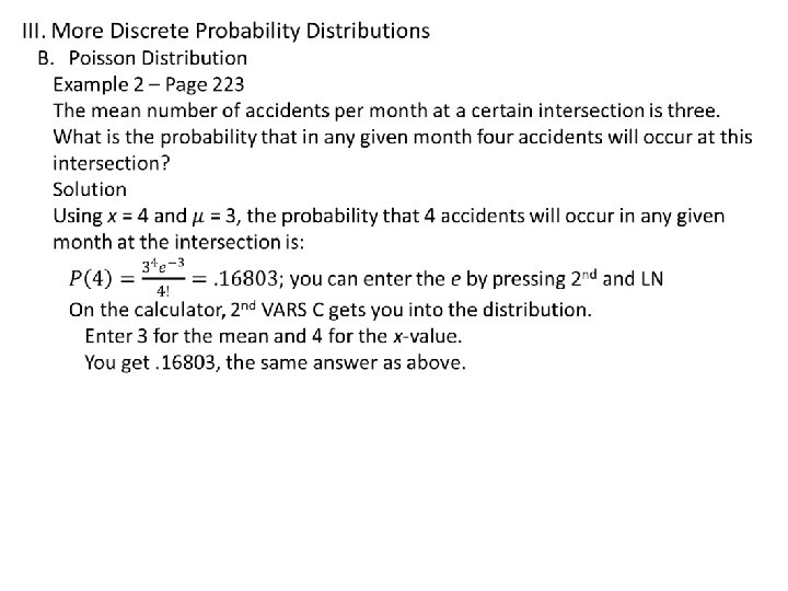III. More Discrete Probability Distributions B. Poisson Distribution Try it Yourself – Page 224 What is the probability that more than four accidents will occur in any given month at the intersection? By hand, we need to find the probabilities for 1, 2, 3, and 4 accidents and add them up. We then subtract that from 1 to get the probability of more than 4 accidents occurring. P(0) =. 04979; P(1) =. 14936; P(2) =. 22404; P(3) =. 22404; P(4) =. 16803 1 – (. 04979 +. 14936 +. 22404 +. 16803) =. 1847 Using the calculator, we use the Poissoncdf function to find the probability of up to 4 accidents occurring and then subtract that from 1. 2 nd VARS D, 3 and 4 =. 81526 1 -. 81526 =. 1847, the same answer we got doing it by hand.