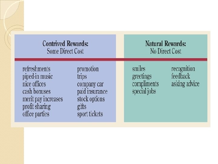 What is involved in learning by reinforcement? Continuous reinforcement ◦ Administering a reward each time the desired behavior occurs. Intermittent reinforcement ◦ Rewards behavior periodically — either on the basis of time elapsed or the number of desired behaviors exhibited. Extinction ◦ The withdrawal of the reinforcing consequences for a given behavior.