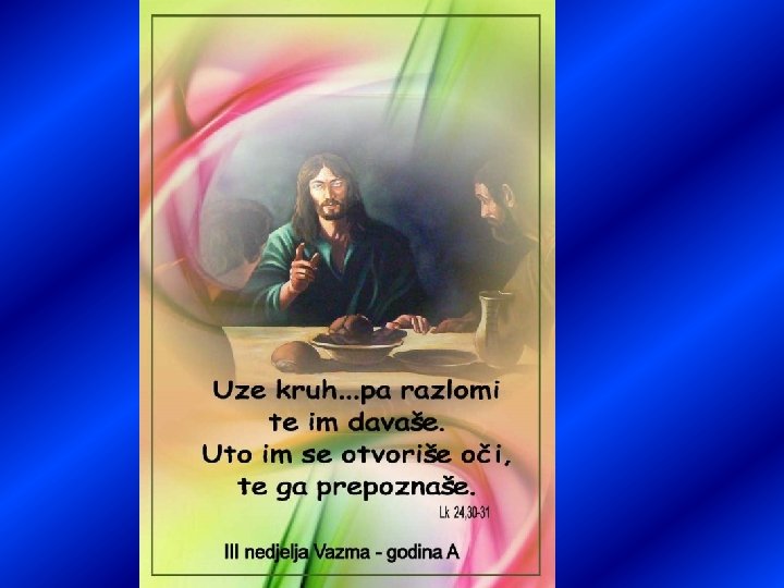 Nije li trebalo da Krist sve to pretrpi te uđe u svoju slavu? « Počevši tada od Mojsija i svih proroka, protumači im što u svim Pismima o njemu. Uto se približe selu kamo su išli, a on kao da htjede dalje. No oni navaljivahu: » Ostani s nama jer zamalo će večer i dan je na izmaku! « I uniđe da ostane s njima. Dok bijaše s njima za stolom, uze kruh, izreče blagoslov, razlomi te im davaše. Uto im se otvore oči te ga prepoznaše, a on im iščeznu s očiju. Tada rekoše jedan drugome: » Nije li gorjelo srce u nama dok nam je putem govorio, dok nam je otkrivao Pisma? « U isti se čas digoše i vratiše u Jeruzalem. Nađoše okupljenu jedanaestoricu i one koji bijahu s njima. Oni im rekoše: » Doista uskrsnu Gospodin i ukaza se Šimunu! « Nato oni pripovjede ono s puta i kako ga prepoznaše u lomljenju kruha. …/…