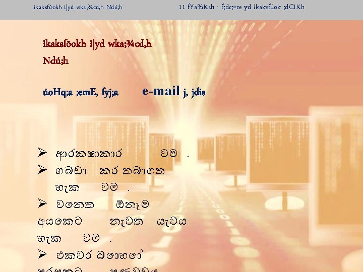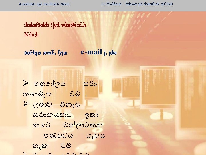 ikaksfúokh i|yd wka; ¾cd, h Ndú; h 11 f. Ya%Ksh - f; dr; =re yd ikaksfúok ; d. CIKh ikaksfõokh i|yd wka; ¾cd, h Ndú; h úo. Hq; a ; em. E, fyj; a e-mail mqoa. , hl=g wka; ¾cd, h yryd úo. Hq; a ; eme, a. s. Kqula idod úo. Hq; a ; eme, a , smskhla ks¾ud. Kh lr. ek. Sfï fiajdj fkdñ, fha , nd fok fjí wvú rd. Yshla mj; S'