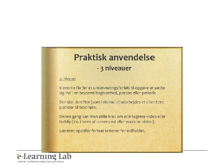 Design af læringsaktiviteter • Tænke i kortere eller længerevarende læringsaktiviteter – som dele af et læringsdesign • Start, midte og afslutning – et pædagogisk narrativ med roller til de forskellige aktører (hvem gør hvad og hvem har ret til hvad? (verificering)) • Et pædagogisk manuskript / drejebog eller pattern / mønster • Kan også være en hjælp til at udveksle erfaringer mellem lærerne!