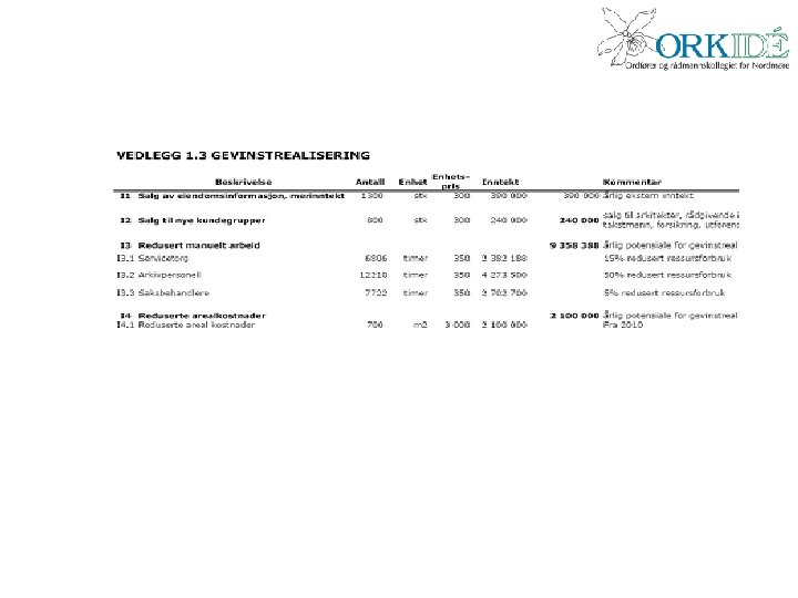 - felles løsninger for felles løft Ønskede gevinster – MÅL Strategisk anvendelse – innsatsområder IKT Infrastruktur Gevinster for innbyggere, næringsliv kommunene, fylket Orkidéportal Sak/arkiv E- forvaltning e. Bygg 2009 Skole Økonomi Helse omsorg OK IT-infrastruktur (datarom etc. ) OK Bredbånd OK Andre virksomhetsområder