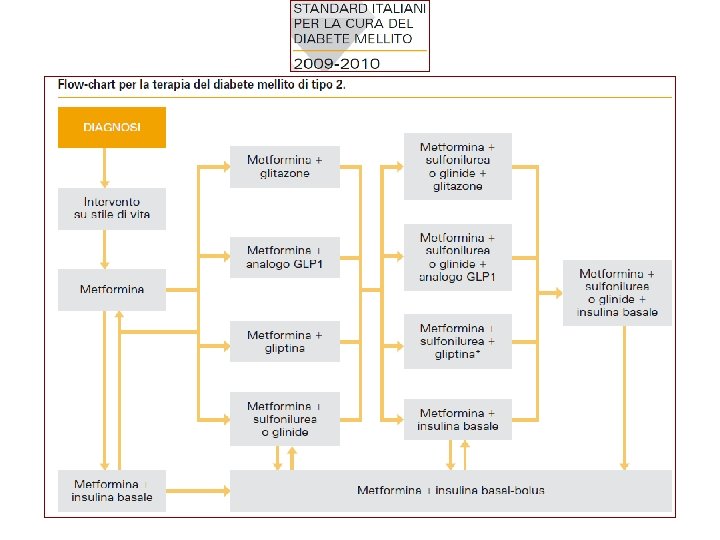 Consensus Statement ADA/EASD 2009 Algoritmo terapeutico del DMT 2 Tier 1: well validated core therapies Lifestyle + Metformin + Basal insulin Diagnosis: Lifestyle + Metformin + Intensive insulin Lifestyle + Metformin + Sulfonylurea Step 1 Step 2 Step 3 Tier 2: Less well validated core therapies Lifestyle + Metformin + Pioglitazone (No hypoglycemia /edema (CHF)/ bone loss) Lifestyle + Metformin + GLP-1 agonist b (no hypoglycemia/weight loss /nausea/vomiting ) Lifestyle + Metformin + Pioglitazone + Sulfonylurea a Lifestyle + Metformin + Basal Insulin