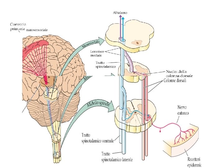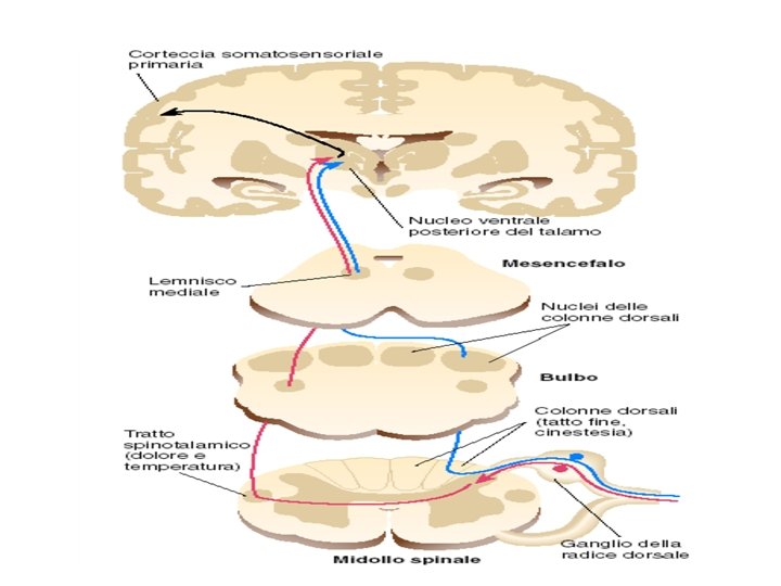 Vie somatosensoriali Le vie somatosensoriali, sono delle vie nervose che trasmettono gli impulsi della sensibilità tattile, propriocettiva(ad una maggiore velocità di conduzione), termica e dolorifica(ad una minore velocità di conduzione). Le principali sono tre: -via delle colonne dorsali lemnisco mediale -via lemnisco spinale -via spino cerebellare