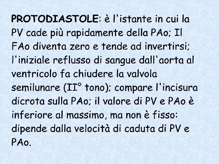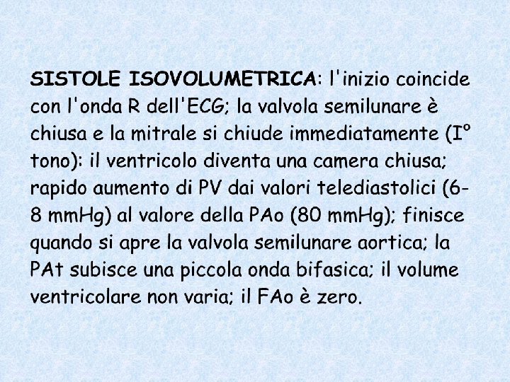In questo (breve) momento entrambe le pressioni stanno scendendo. Inizialmente, la velocità di caduta della pressione è la stessa, ma arriva il momento in cui la PV cade più rapidamente della PAo e questo fa chiudere la valvola. Fattori che determinano la velocità di caduta di PV: rimozione del Ca 2+ dal sarcoplasma (fattore lusitropo). È aumentata dalla stimolazione del simpatico; è diminuita dall’ischemia Fattori che determinano la velocità di caduta di PAo: la pressione arteriosa scende durante la diastole in modo esponeziale, secondo una costante di tempo t=R*C R = resistenze periferiche totali C = compliance arteriosa