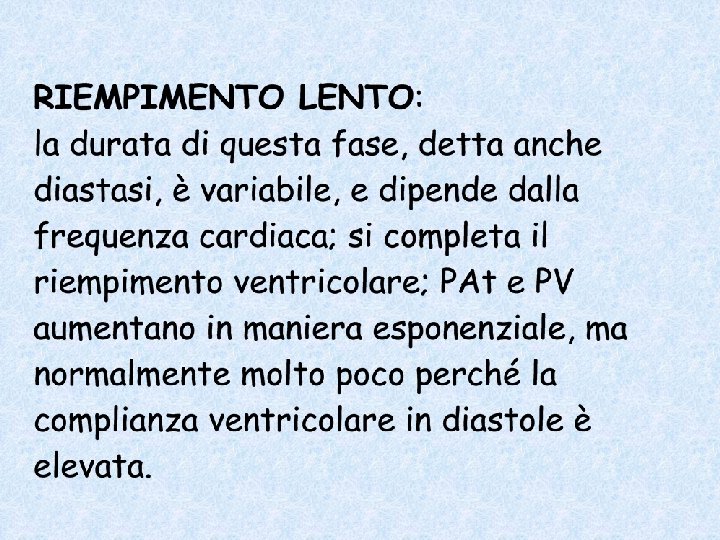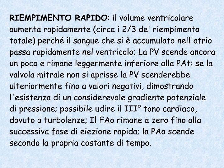 DIASTOLE ISOVOLUMETRICA: la PV scende rapidamente; la PAo scende molto più lentamente; il volume ventricolare non varia, perché il ventricolo è ancora una camera chiusa; finisce quando PV diventa più piccola di PAt e la valvola mitrale si apre: questo avviene ad una pressione più elevata di quella di chiusura, perché l'atrio ha continuato a riempirsi.