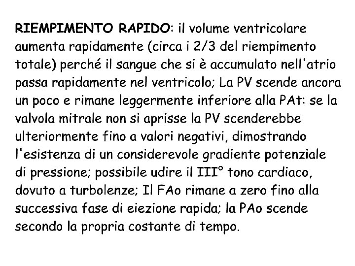 DIASTOLE ISOVOLUMETRICA: la PV scende rapidamente; la PAo scende molto più lentamente; il volume ventricolare non varia, perché il ventricolo è ancora una camera chiusa; finisce quando PV diventa più piccola di PAt e la valvola mitrale si apre: questo avviene ad una pressione più elevata di quella di chiusura, perché l'atrio ha continuato a riempirsi.