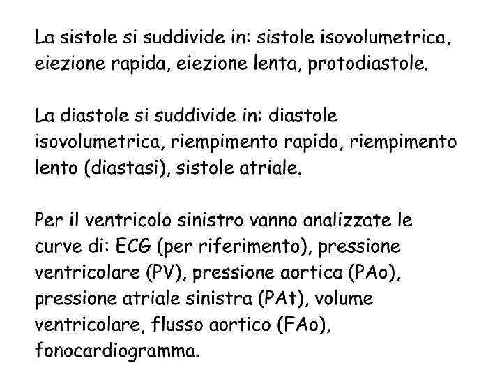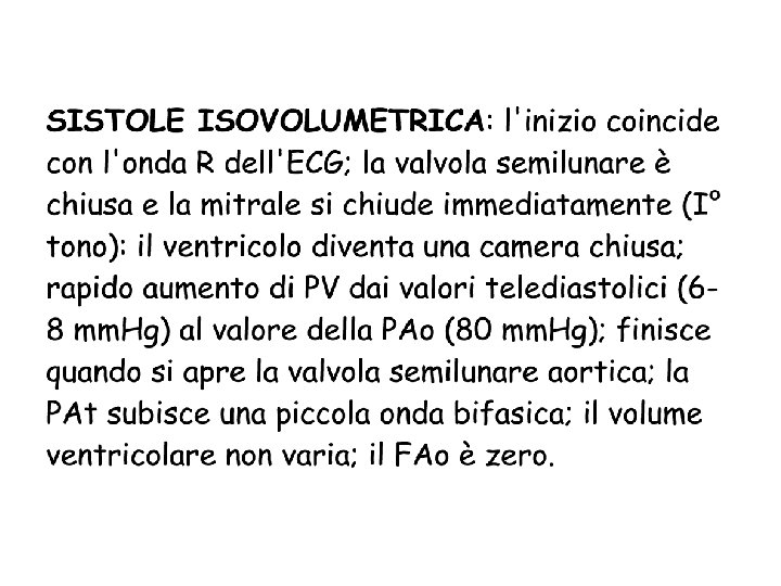 In questo (breve) momento entrambe le pressioni stanno scendendo. Inizialmente, la velocità di caduta della pressione è la stessa, ma arriva il momento in cui la PV cade più rapidamente della PAo e questo fa chiudere la valvola. Fattori che determinano la velocità di caduta di PV: rimozione del Ca 2+ dal sarcoplasma (fattore lusitropo). È aumentata dalla stimolazione del simpatico; è diminuita dall’ischemia Fattori che determinano la velocità di caduta di PAo: la pressione arteriosa scende durante la diastole in modo esponeziale, secondo una costante di tempo t=R*C R = resistenze periferiche totali C = compliance arteriosa