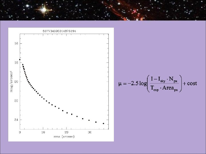 La magnitudine è stata calcolata tenendo conto di: • Intensità luminosa all’interno dell’isofota più esterna(I) • Interferenza della luminosità di fondo del cielo (Isky) • Tempo di esposizione (Texp)