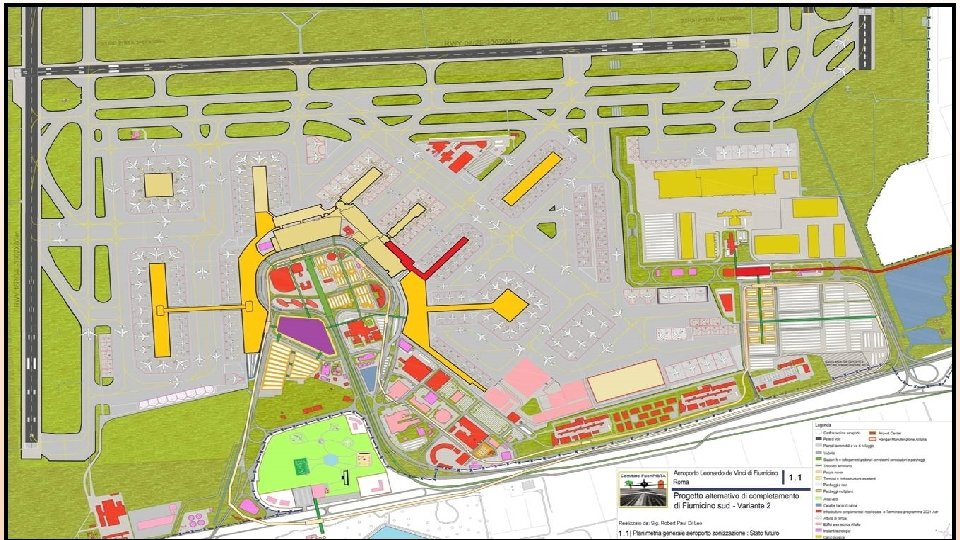 La Terminal Area del Progetto Alternativo • Il nuovo layout proposto da questo progetto per FCO Sud presenta 227 parcheggi • (a LHR sono 212) dei quali 54 per Wide Body. • Le taxiway sono idonee al transito fino ai velivoli Wide Body classe F (B 747 -8, A 380). • I Terminal, consegutivi tra loro, sono asserviti da un people mover il cui percorso copre sia i parcheggi auto che un’area ricreativa e archeologica come nei migliori Hub del mondo. • E’ idoneo a sostenere tutto il traffico indicato dalle più rosee previsioni di ADR/ENAC fino al 2040 ed oltre. • Permette la realizzazione dei terminal, a richiesta d’incremento del traffico, in maniera graduale nel tempo.