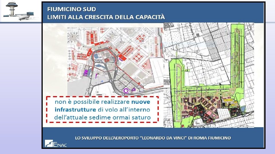 Le motivazioni di ADR/ENAC per FCO Nord Le slides che seguono sono estratte dalla presentazione: ‘’Lo sviluppo dell’aeroporto internazionale Leonardo da Vinci di Fiumicino’’ fatta da ENAC nel 2015 e scaricabile dal loro sito. Presentazione in cui si dimostra la necessità di realizzare FCO Nord