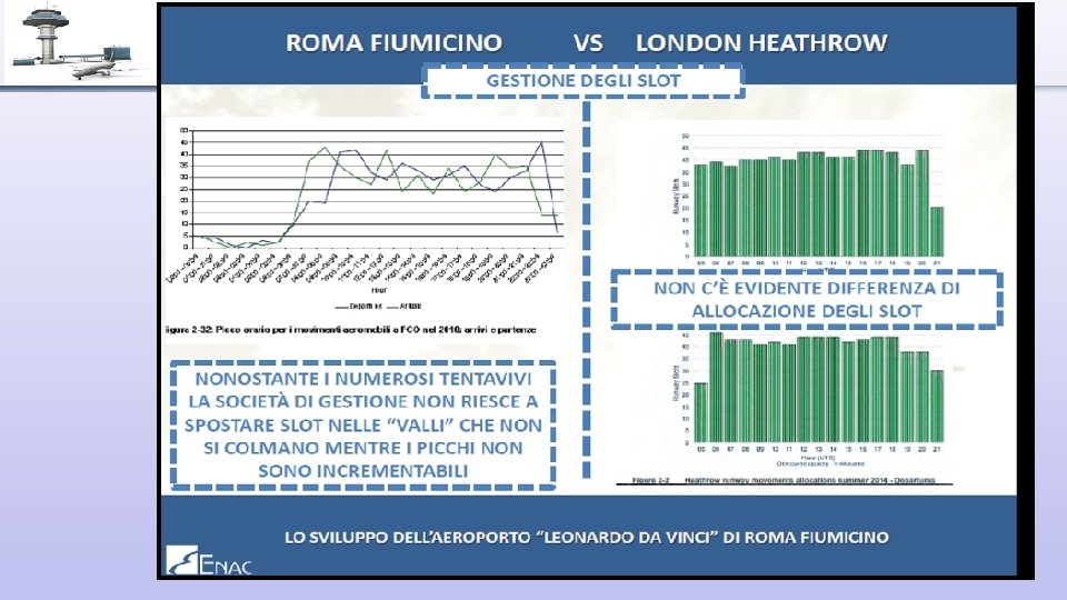 PERCHE’ SERVONO ALTRE 2 PISTE A FCO? • Perché si prevedono per il 2045 gli stessi passeggeri di Heathrow nel 2015. Ma, secondo ENAC, rispetto a LHR: • FCO ha un layout aeroportuale sfavorevole. • Non ha abbastanza parcheggi. • Quasi tutto il traffico è Narrow Body (Es. B 737, A 320, CS 300, CRJ, Embraer) ed ha pure meno movimenti. • Ha un servizio ATC con ‘’regole diverse’’ da cui il limite di 90 Mov/ora. • Ha una distribuzione di voli con picchi orari.