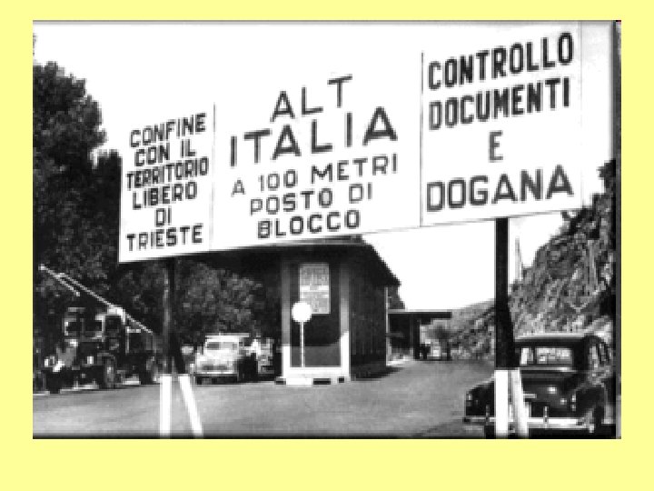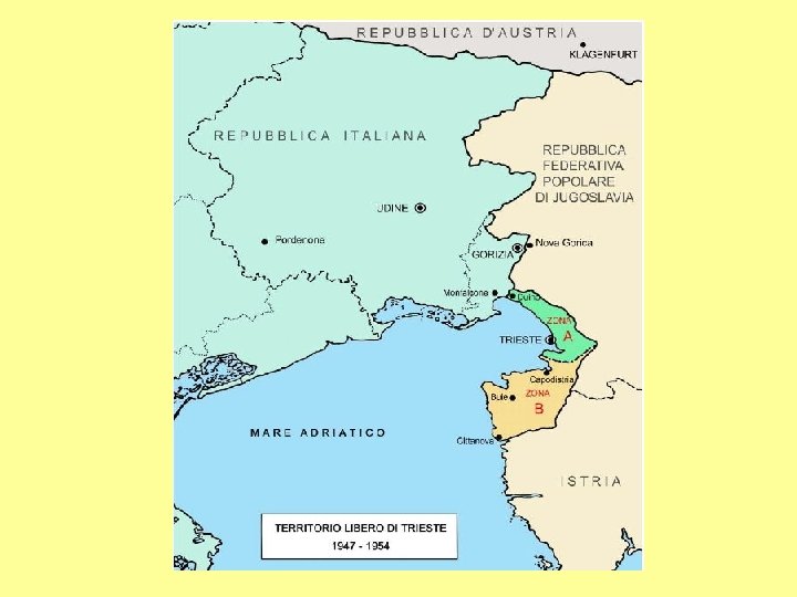 Il 10 febbraio del 1947 venne firmato il TRATTATO DI PACE CON L’ITALIA (Trattato di Parigi), che istituì il Territorio libero di Trieste, costituito dal litorale triestino e dalla parte nordoccidentale dell'Istria, provvisoriamente diviso da una linea confinaria passante a sud della cittadina di Muggia ed amministrato rispettivamente dal Governo Militare Alleato (zona A) e dall'esercito jugoslavo (zona B), in attesa della creazione degli organi costituzionali del nuovo stato.