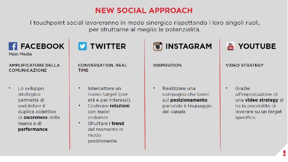 Dall’atl al social, con la stessa identità. Il primo step è uniformare la comunicazione dall’ATL al social, per dare un’identità unica al brand. In questo modo offriamo continuità alla campagna e al posizionamento, trasferendo i format visivi delle campagne ATL, adeguandoli allo stile e ai linguaggi dei canali social.