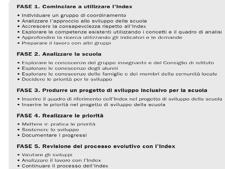 INDEX - livello scuola Esplora 3 dimensioni a) Creare culture inclusive Sezione A. 1 costruire comunità Sezione A. 2 Affermare valori inclusivi b) Produrre politiche inclusive Sezione B. 1 Sviluppare la scuola per tutti Sezione B. 2 Organizzare il sostegno alla diversità c) Sviluppare pratiche inclusive Sezione C. 1 Coordinare l’apprendimento