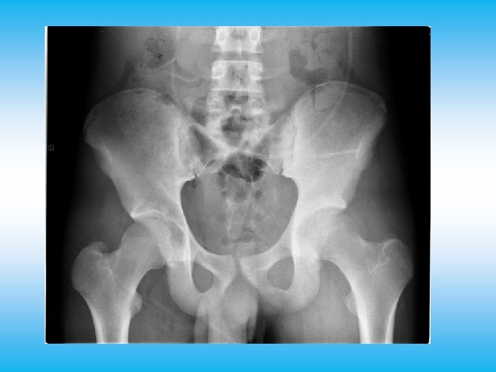 David 17 aa • Da 3 mesi, dopo caduta da bicicletta con trauma all’anca sx, dolore in regione inguinale con zoppia esacerbato dallo sforzo; ecografia anca negativa, rx con lieve riduzione in ampiezza della coxo-femorale • persistenza del dolore che è divenuto continuo nuova radiografia del bacino • A livello inguinale sx e coscia medialmente palpabile tumefazione di consistenza dura a margini sfumati, fissa • Emocromo nella norma, VES 15, LDH 716 • RNM: . . diffusa omogenea alterazione dell’emibacino sx che risparmia solamente il versante sacrale dell’articolazione sacro-iliaca, capta mdc ed è circondata da manicotti di tessuto solido