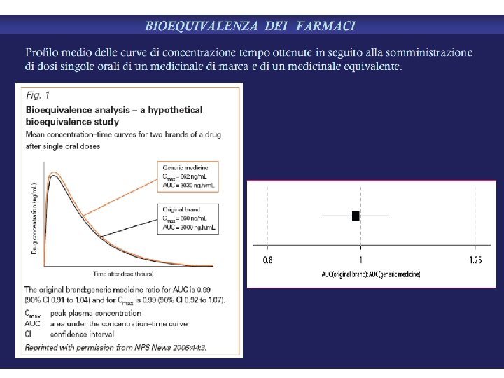 Parametri valutati per la bioequivalenza • Tmax: tempo di picco della concentrazione plasmatica del farmaco. • Cmax: concentrazione di picco plasmatica del farmaco. • AUC: area sottesa dalla curva delle concentrazioni plasmatiche di farmaco in relazione al tempo.