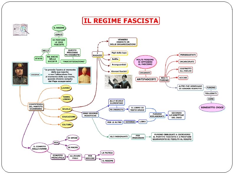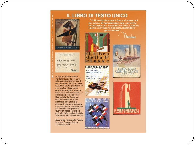 GRAZIE ANCHE A UN'INTENSA PROPAGANDA SU RADIO E GIORNALI, SI ARRIVO' A CONTROLLARE OGNI ASPETTO DELLA VITA DEI CITTADINI FIN DA QUANDO ERANO PICCOLI. LA SCUOLA FU AMPIAMENTE RIFORMATA (RIFORMA GENTILE) E FU INTRODOTTO UN RIGIDO CONTROLLO SULL'INSEGNAMENTO, CON L'ADOZIONE DEL LIBRO DI TESTO UNICO E L'OBBLIGO PER TUTTI I DIPENDENTI PUBBLICI DI GIURARE FEDELTA' AL REGIME