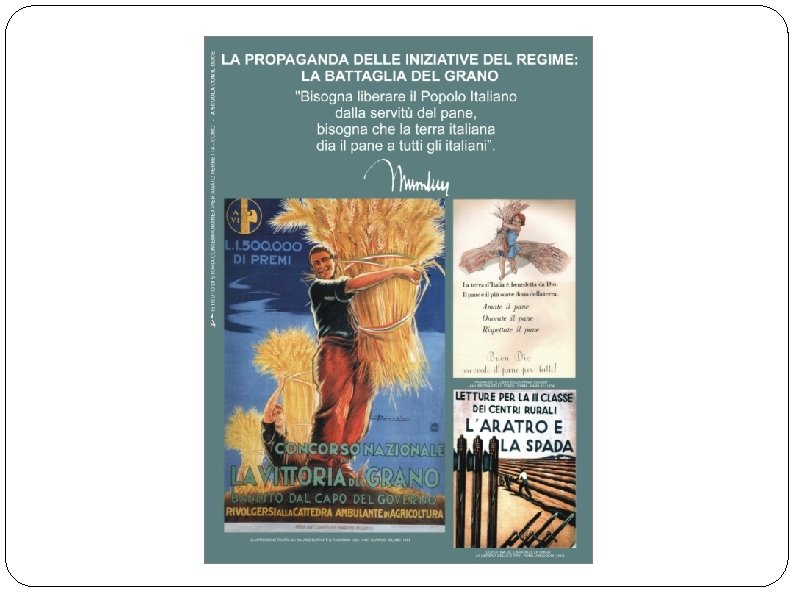 OVVIAMENTE IL “DUCE” TENTO' ANCHE DI MODERNIZZARE L'ITALIA SOTTO IL PROFILO ECONOMICO: FAVORI' LA PRODUZIONE DI MERCI ITALIANE SCORAGGIANDO LE IMPORTAZIONI, COSTRUENDO NUOVE AUTOSTRADE E CITTA'. GRANDE IMPORTANZA RIVESTI' LA POLITICA AGRARIA, CARATTERIZZATA DALLA BATTAGLIA DEL GRANO: FU STABILITO CHE L'ITALIA DOVESSE RAGGIUNGERE L'AUTOSUFFICIENZA ALIMENTARE AUMENTANDO LA PRODUZIONE DI FRUMENTO PER EVITARE L'IMPORTAZIONE DAGLI STATI UNITI E