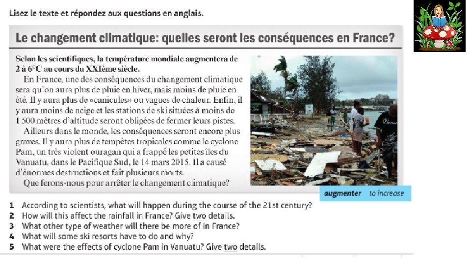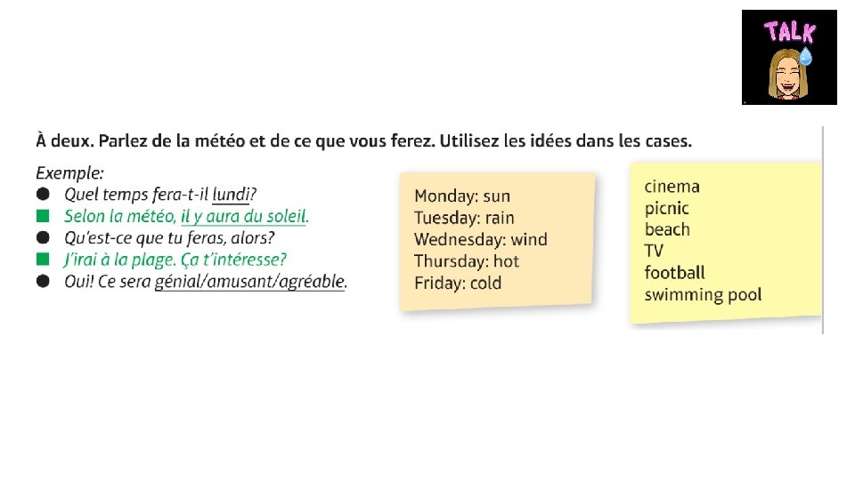A French friend is going to spend one week in your house. Write him or her a message to explain what you will do everyday. 120 WORDS. • • • Weather for three days. Activities for three days. Opinions on these activities. At least 4 different sequencers. Two activities you did last week. Your opinion about these activities. Please, send this to Miss Abellan. Merci