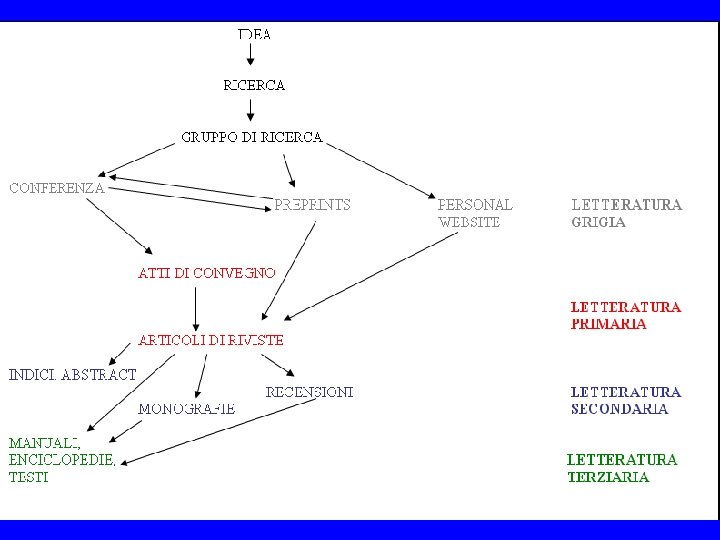 IL FLUSSO DELLE INFORMAZIONI SCIENTIFICHE Il seguente diagramma illustra il flusso delle informazioni scientifiche. L’informazione si muove attraverso questo processo ciclico, che tende alla sua massima formalizzazione. Spesso passano molti anni tra una nuova scoperta e la sua pubblicazione.