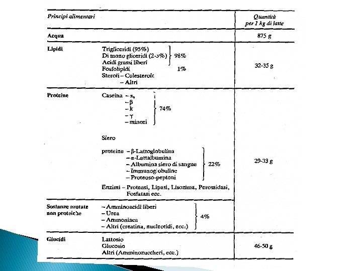 IL Latte Donna Vaccino Bufala Capra Pecora Renna Residuo secco 12. 2 12. 5 17. 5 13. 2 18. 0 32. 0 Lipidi Lattosio 3. 8 3. 5 7. 5 4. 2 7. 2 17. 2 6. 5 4. 8 4. 4 4. 8 2. 6 Proteine Caseine 1. 3 3. 4 5. 0 3. 8 5. 5 10. 5 28 78 80 76 80 83 Ceneri 0. 2 0. 8 1. 0 1. 5 Composizione media percentuale del latte di alcuni mammiferi