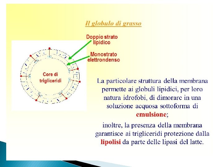 I GRASSI Organizzato in forma di globuli circondato da una membrana lipoproteica. Nella membrana sono presenti fosfolipidi, steroli e carotenoidi che orientano la parte polare verso il mezzo acquoso e la parte apolare verso la frazione gliceridica che costituisce il globulo