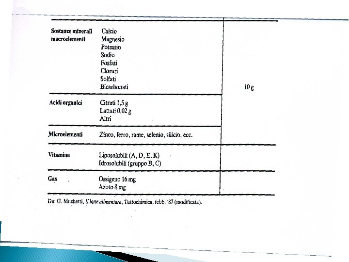 IL Latte Donna Vaccino Bufala Capra Pecora Renna Residuo secco 12. 2 12. 5 17. 5 13. 2 18. 0 32. 0 Lipidi Lattosio 3. 8 3. 5 7. 5 4. 2 7. 2 17. 2 6. 5 4. 8 4. 4 4. 8 2. 6 Proteine Caseine 1. 3 3. 4 5. 0 3. 8 5. 5 10. 5 28 78 80 76 80 83 Ceneri 0. 2 0. 8 1. 0 1. 5 Composizione media percentuale del latte di alcuni mammiferi