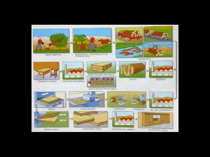 Ciclo produttivo 1. Sramatura- consiste nel taglio dei rami che vengono usti come legna da ardere 2. Abbattimento- avviene generalmente in inverno , quando l’attività vegetativa è minima 3. Scorteciatura 4. Depezzatura o troncatura- i tronchi possono essere trasportati interi o tagliati in pezzi più corti 5. Trasporto- per via terrestre, per via d’acqua (fluitazione), per via aerea 6. Lisciviazione- procedimento per eliminare le sostanze che possono imputridire nutrimento di batteri e muffe mediante lavaggio con acqua corrente 7. Taglio e stagionatura- i legni sono tagliati in tavole o travi che sono sottoposte a stagionatura.