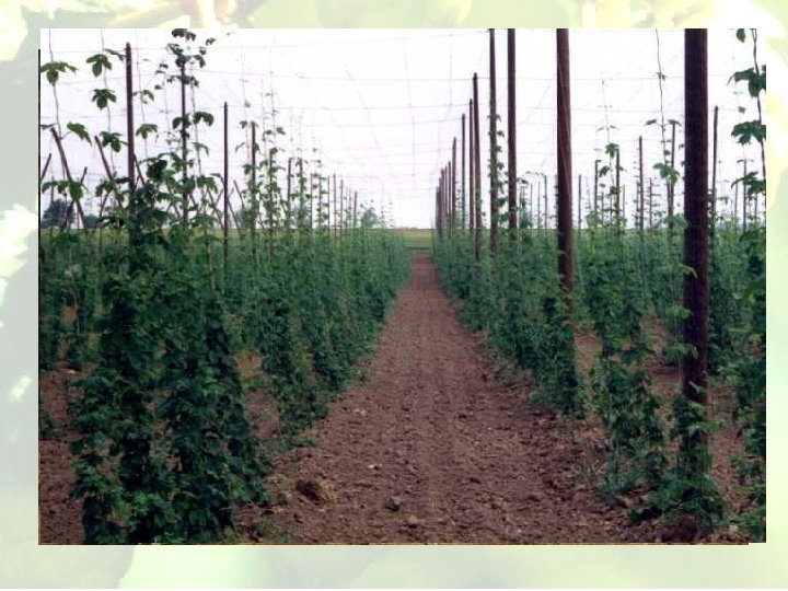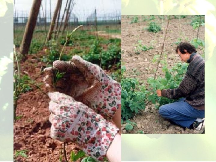 Primavera - distribuzione 2° parte fertilizzanti di sintesi N, P, K, Mg - livellamento della superficie con le ruspe - erpici - germoglia in marzo – taglio del legno nuovo (fino a fine aprile) - filo accompagnatorio di metallo – 8 paia di fili tra 2 pali - ogni pianta 1 paio di fili - diametro di filo 1; 1, 06; 1, 12; 1, 25 mm - accompagnamento di luppolo sul filo di metallo- 2 fusti ad ogni filo – 2 fusti di riserva sono lasciati liberi a terra (metà maggio) - distribuzione nitrato ammonico (NH 4 NO 3 e Ca. CO 3 con 27% N) 2, 5 -3 t/ha (maggio) - ogni 14 gg – arieggiare suolo con erpice
