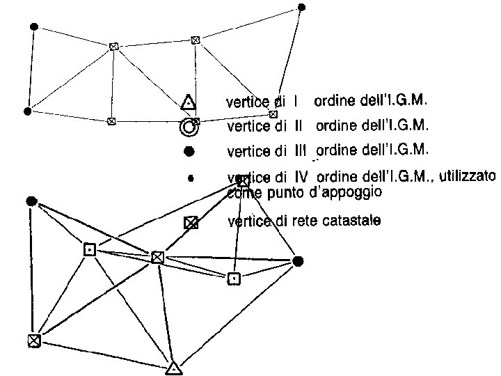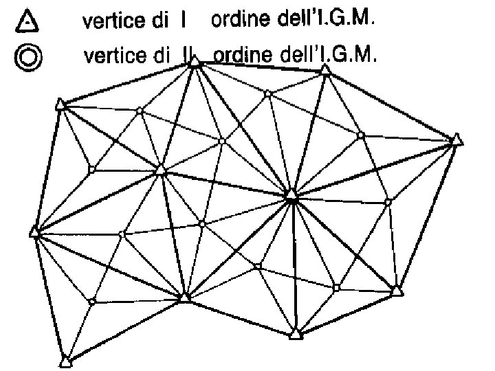 GERARCHIA DELLE RETI GEODETICA (nazionale) DI PRIMO ORDINE = da 20 a 60 km. RETI TRIGONOMETRICHE INTEGRATE: DEL I° ORDINE = RETE GEODETICA DEL II° ORDINE = da 15 a 30 km. DEL III° ORDINE = da 10 a 20 km. DEL IV° ORIDNE = da 3 a 10 km.