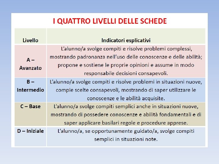 LE CARATTERISTICHE DEL MODELLO NAZIONALE PROPOSTO • Definizione di 4 livelli, di cui quello "iniziale“ predisposto per favorire un’adeguata conoscenza e valorizzazione di ogni alunno, anche nei suoi progressi iniziali e guidati (principio di individualizzazione) • Mancanza di un livello negativo quindi funzione pro‐attiva di certificazione in progress delle competenze che, nell'arco dell'obbligo, sono in fase di acquisizione • Presenza di spazi aperti per la descrizione di competenze ad hoc per ogni allievo (principio di personalizzazione) • Sottoscrizione e validazione del documento da parte dei docenti e del dirigente scolastico,