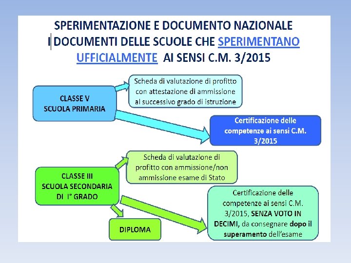 CIRCOLARE N. 3 DEL 12. 02. 2015 § Sottolinea, la valenza educativa, di documentazione del percorso compiuto riferito al "profilo delle competenze" in uscita dal primo ciclo, che rappresenta «l'obiettivo generale del sistema educativo e formativo italiano» . § Il testo definitivo delle Indicazioni Nazionali consente di procedere alla adozione di un modello di certificazione nazionale, così come previsto dalla L. 53/03 per fornire un quadro di riferimento unitario e coerente : - alle istituzioni scolastiche del primo ciclo - alle famiglie degli allievi - alle istituzioni scolastiche e formative del secondo ciclo, in cui si completa il percorso dell'obbligo di istruzione al 16° anno di età (Legge n. 296/2006)