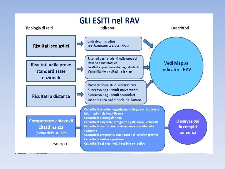 IL RACCORDO CON IL RAV LE COMPETENZE CHIAVE NELL’ AUTOVALUTAZIONE DELLA SCUOLA 1. Nel Rapporto di Autovalutazione delle scuole, previsto dal Sistema Nazionale di Valutazione si devono descrivere i risultati conseguiti dall’istituzione rispetto agli apprendimenti degli studenti e su quali processi si agisce per migliorarli 2. Tra gli esiti, non sono richiesti solo i saperi disciplinari, gli esiti a distanza di tempo, gli abbandoni, ecc. , ma anche i risultati rispetto alle competenze chiave di cittadinanza. 3. Non si possono avere esiti, se il curricolo e la didattica non sono stati organizzati e realizzati per competenze e per competenze chiave